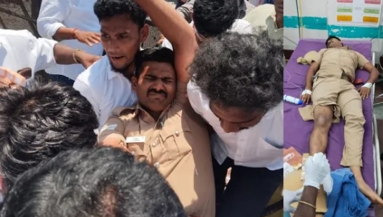 இதனால் கடுமையாக காயமடைந்த போலீஸ்காரர் வலியால் தவித்தார். உடனடியாக அங்கு இருந்த போலீசார் மற்றும் தொண்டர்கள் அவரை மீட்டு ஆம்புலன்ஸில் அருகிலுள்ள மருத்துவமனைக்கு கொண்டு சென்றனர். அங்கு அவருக்கு தீவிர சிகிச்சை அளிக்கப்பட்டு வருகிறது. அவரது காலில் எலும்பு முறிவு ஏற்பட்டுள்ளதாக தகவல்கள் வெளியாகியுள்ளன.